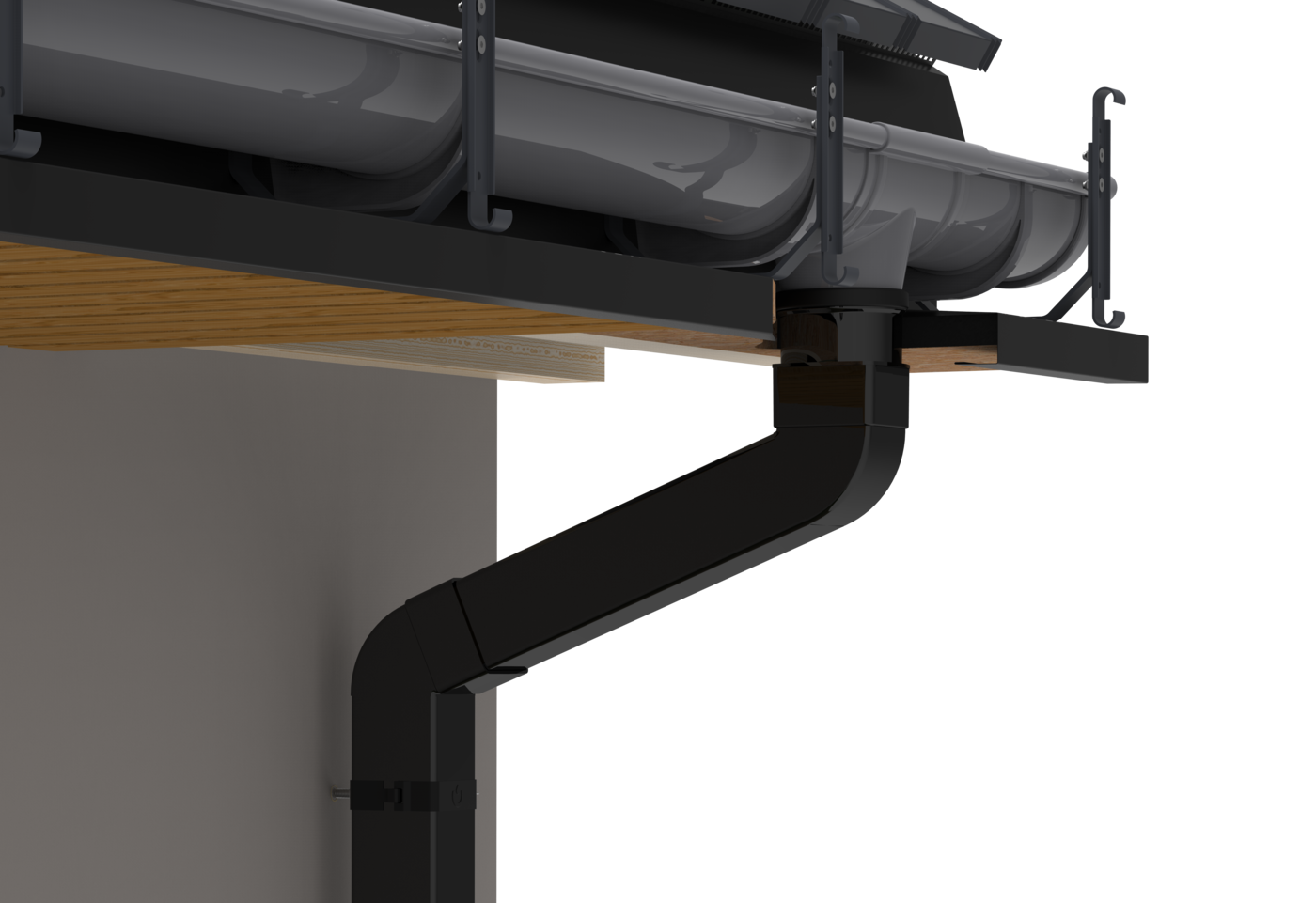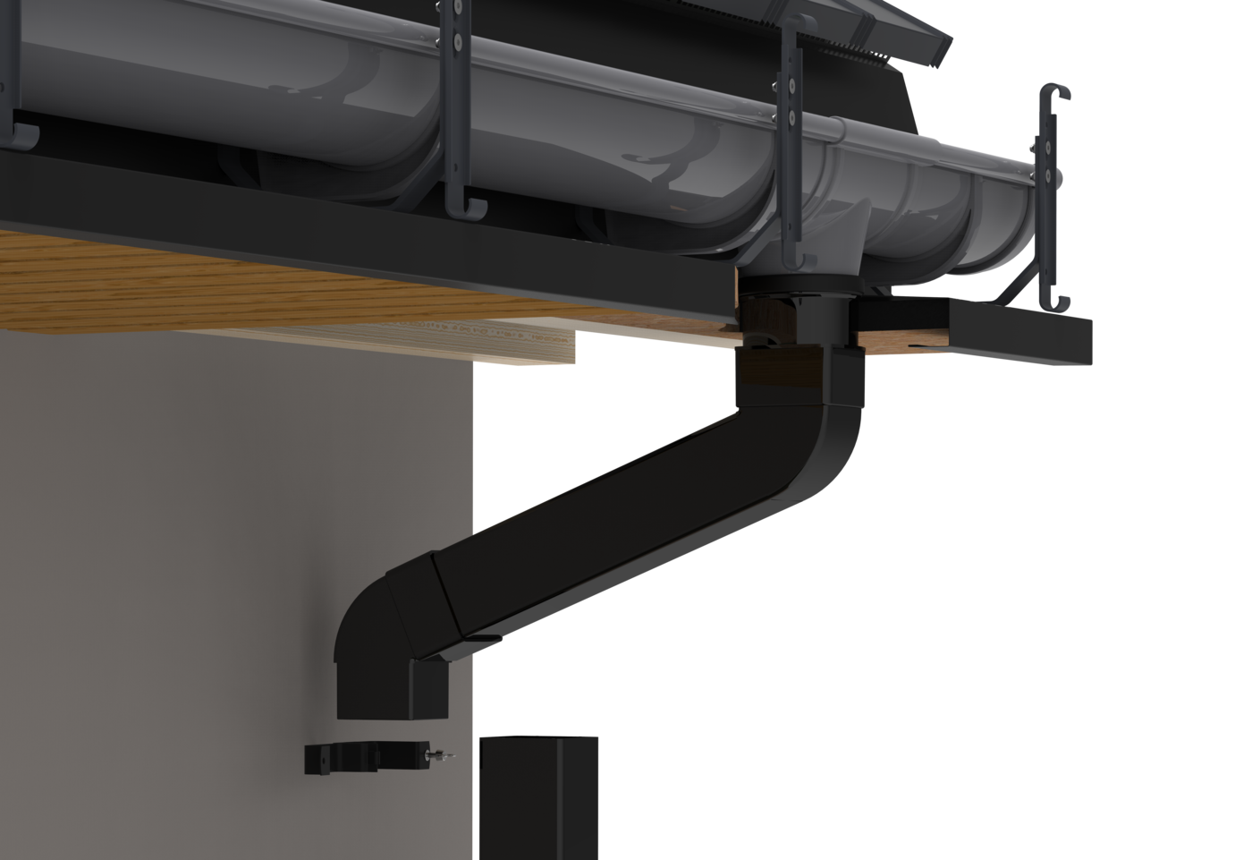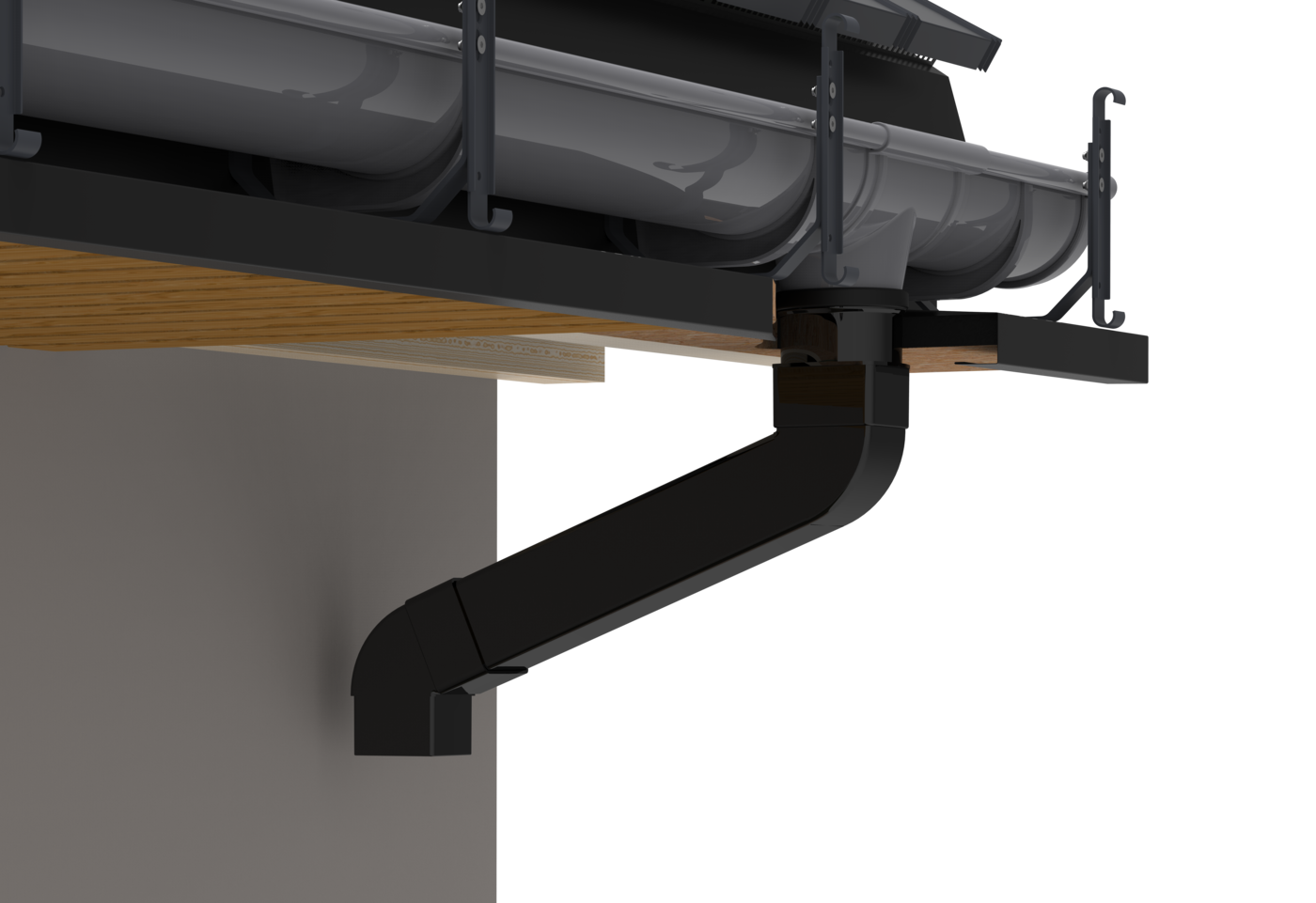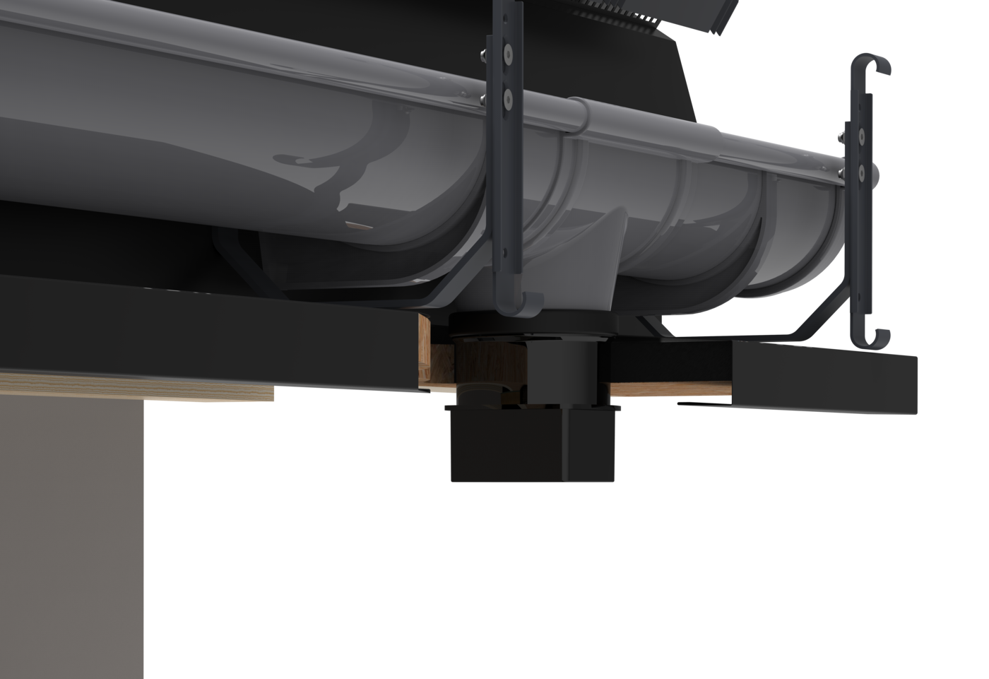 Найдальші від зливного бункера передні гаки (гаки в найвищій точці встановлення) монтуються на висоті першого отвору в гаку кришки. Максимальна відстань зачепів 60 см. Передні гаки ПВХ з найнижчою точкою кріплення монтуються врівень з другим отвором гачка решітки. Максимальний ухил, який ми можемо використовувати в системі прихованих водостоків, становить до 3% (3 см на 10 метрів ринви).