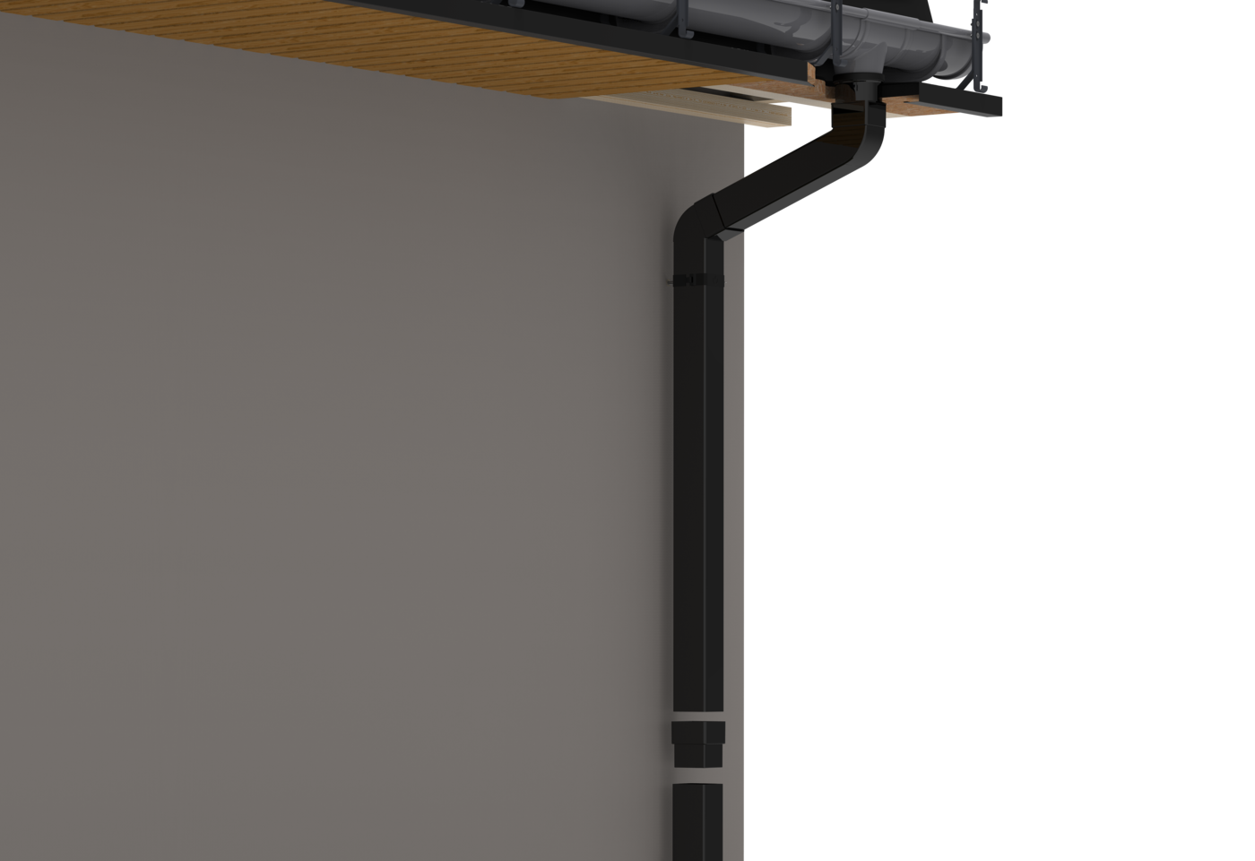 Після розміщення водостічних труб в ізоляційному фітингу та затягуванні сталевих хомутів усе закривається кришкою фітинга з пінополістиролу. Склеюємо клеєм для пінополістиролу або монтажною піною низького тиску. Подальші роботи виконуємо відповідно до рекомендацій виробників утеплювачів та штукатурок.